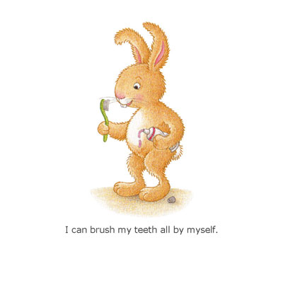 This is Little Bunny. He might only be little, but he can still do lots of things. He can do roly-polys, and in the mornings he can get dressed and brush his teeth all by himself.