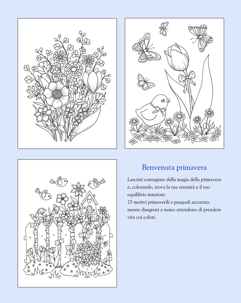 Benvenuta primaveraLasciati contagiare dalla magia della primavera e, colorando, trova la tua serenità e il tuo equilibrio interiore.