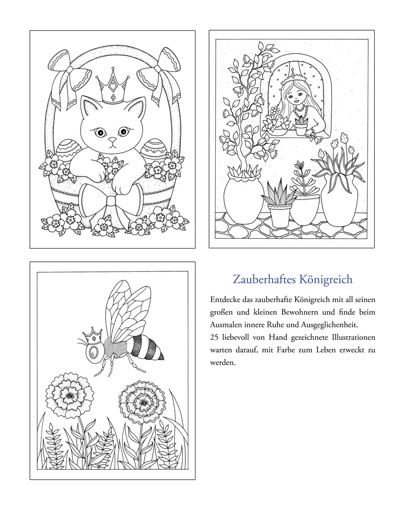 Ein königliches Schloss, eine kleine Prinzessin, viele große und kleine Bewohner des Königreichs und viele weitere zauberhafte Motive warten darauf, mit Farbe zum Leben erweckt zu werden.