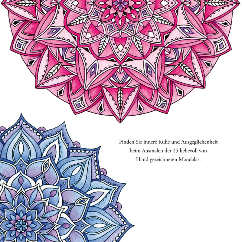 Finden Sie innere Ruhe und Ausgeglichenheit beim Ausmalen der 25 liebevoll von Hand gezeichneten Mandalas.