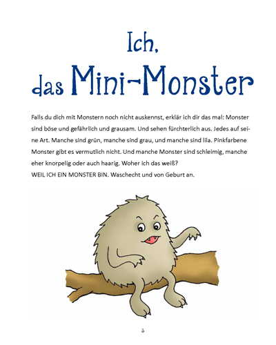 Familie Mini-Monster lebt glücklich und zufrieden in ihrer gemütlichen Wohnung unter der alten Eiche. Der Sohnemann will jedoch mehr. Ein echtes, schreckliches Monster will er werden. Dabei hilft ihm die Eule Petrosinius mit wertvollen Tipps. Und außerdem gibt es da auch noch die Hexe Furunkel...