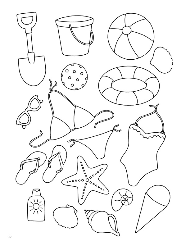 ein Seepferdchen, Delfine, Quallen, hungrige Piranhas, eine Meeresschildkröte, einen Kraken, einen Seestern, viele Fische, drei Labyrinthe, Muscheln, ein Muschelmandala, eine Muschelkette, Flip Flops, einen Bikini, einen Badeanzug, Sonnenbrillen, Ringe und Armbänder, leckere Fruchtcocktails, Eiscreme, Schmetterlinge, Federn, ein Segelschiff, Surfbretter, ein Rezept für ein leckeres Erdbeersorbet und vieles mehr.