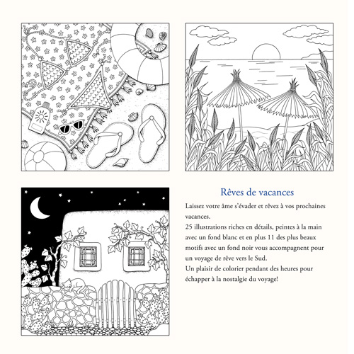 Un livre de coloriage destiné au rêve et à la détente. Des motifs de vacances en Méditerranée: l’été, le soleil, la plage et la mer.