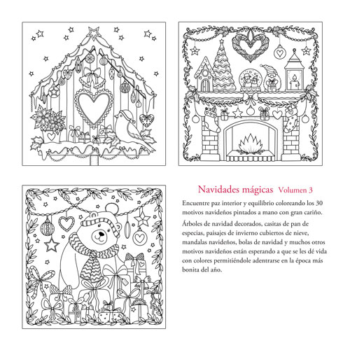 Árboles de navidad decorados, casitas de pan de especias, paisajes de invierno cubiertos de nieve, mandalas navideños, bolas de navidad y muchos otros motivos navideños están esperando a que se les dé vida con colores permitiéndole adentrarse en la época más bonita del año.