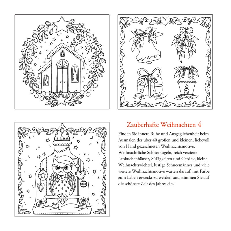 Weihnachtliche Schneekugeln, reich verzierte Lebkuchenhäuser, Süßigkeiten und Gebäck, kleine Weihnachtswichtel, lustige Schneemänner und viele weitere Weihnachtsmotive warten darauf, mit Farbe zum Leben erweckt zu werden und bescheren der ganzen Familie zahlreiche Stunden weihnachtlicher Ausmalfreude und Entspannung.